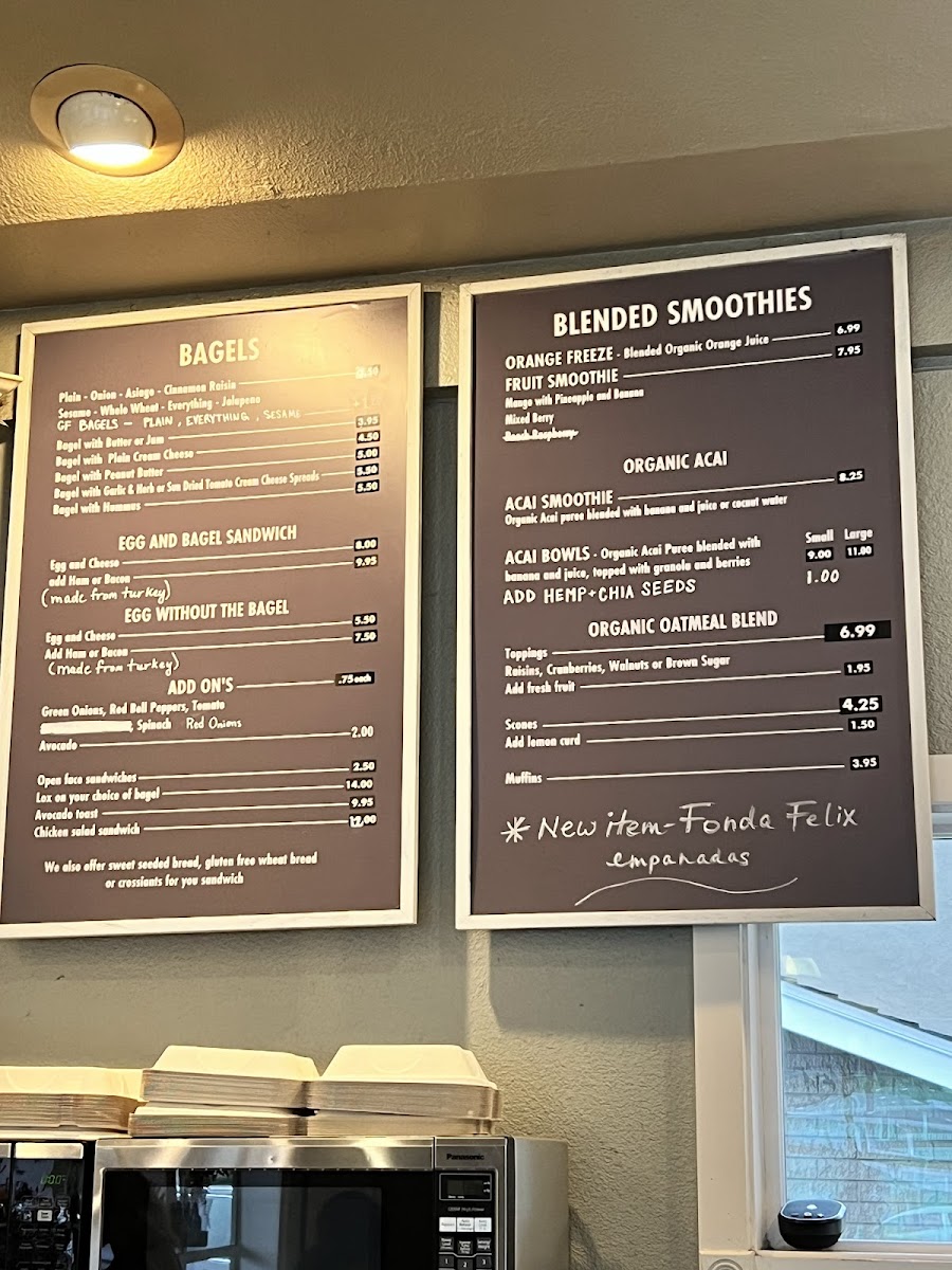 Baked Goods and Breakfast Items: The menu offers various fresh baked goods including muffins, coffee cakes, cookies, biscotti, and pastries such as blueberry and apricot/almond scones. Breakfast options include bagels (with house-made spreads), quiche, and other morning specialties, including gluten-free bagel options.